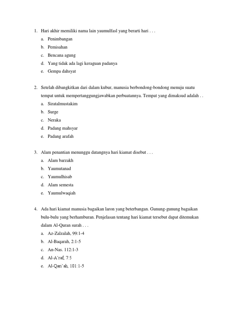 Ini pertanyaan yang sering keluar saat ujian pelajaran Agama Islam di sekolah SD dan SMP. Alam ini merupakan pembatas antara kehidupan dunia dan kehidupan akherat. Hari berkumpulnya seluruh umat manusia sejak zaman Nabi Adam sampai umat akhir zaman di suatu tempat yang sangat luas disebut a.