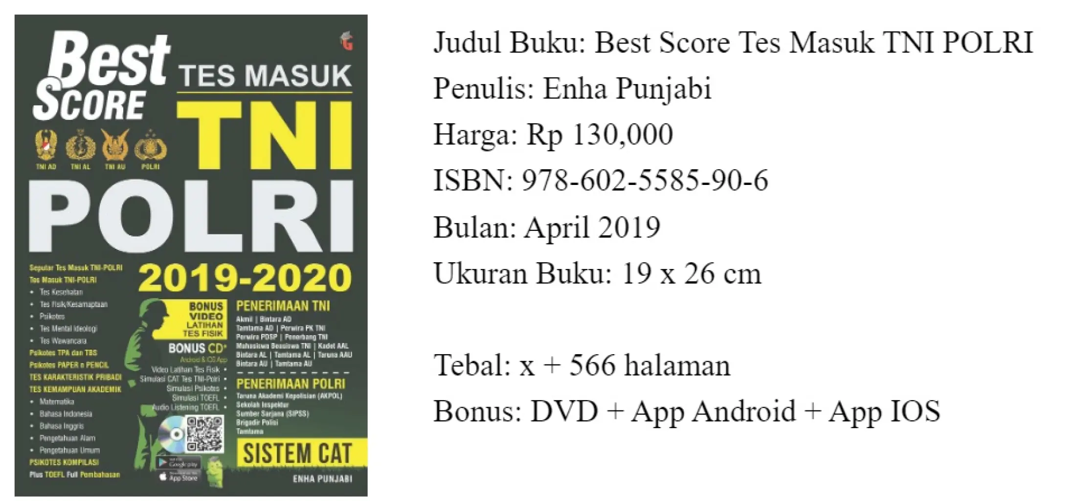 Informasi terbaru seputar soal dan pembahasan tes akademik dan tes psikotes TNI POLRI. Jual BestSeller Best Score Tes Masuk TNI POLRI 2020-2021 dengan harga Rp147000 dari toko online Jejualonline s Jakarta Selatan. Semoga artikel ini bisa membantu kalian semua dalam belajar dan semoga hasil ujian kalian dalam waktu dekat ini mendapatkan hasil sesuai harapan kalian.