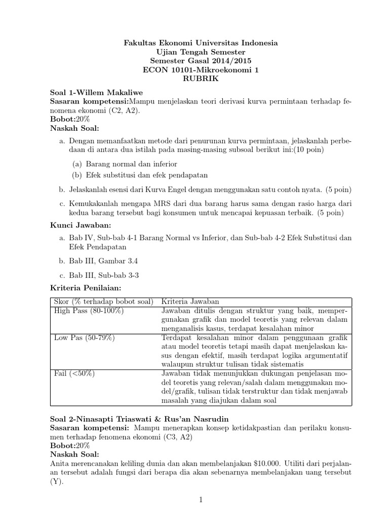 Soal uts pengantar ekonomi mikro semester 1. Soal Bahasa Jawa Kelas 1 Semester 1 Pdf Soal uas bahasa jawa sd kelas 1 semester 1 terbaru 2019 sumber. Fakultas Ekonomi Universitas Indonesia Ujian Tengah Semester Semester Gasal 20142015 ECON 10101-Mikroekonomi 1 RUBRIK Soal 1-Willem Makaliwe Sasaran kompetensiMampu menjelaskan teori derivasi kurva permintaan terhadap fe- nomena ekonomi. Berikut data-data permasalahan ekonomi mikro dan makro.